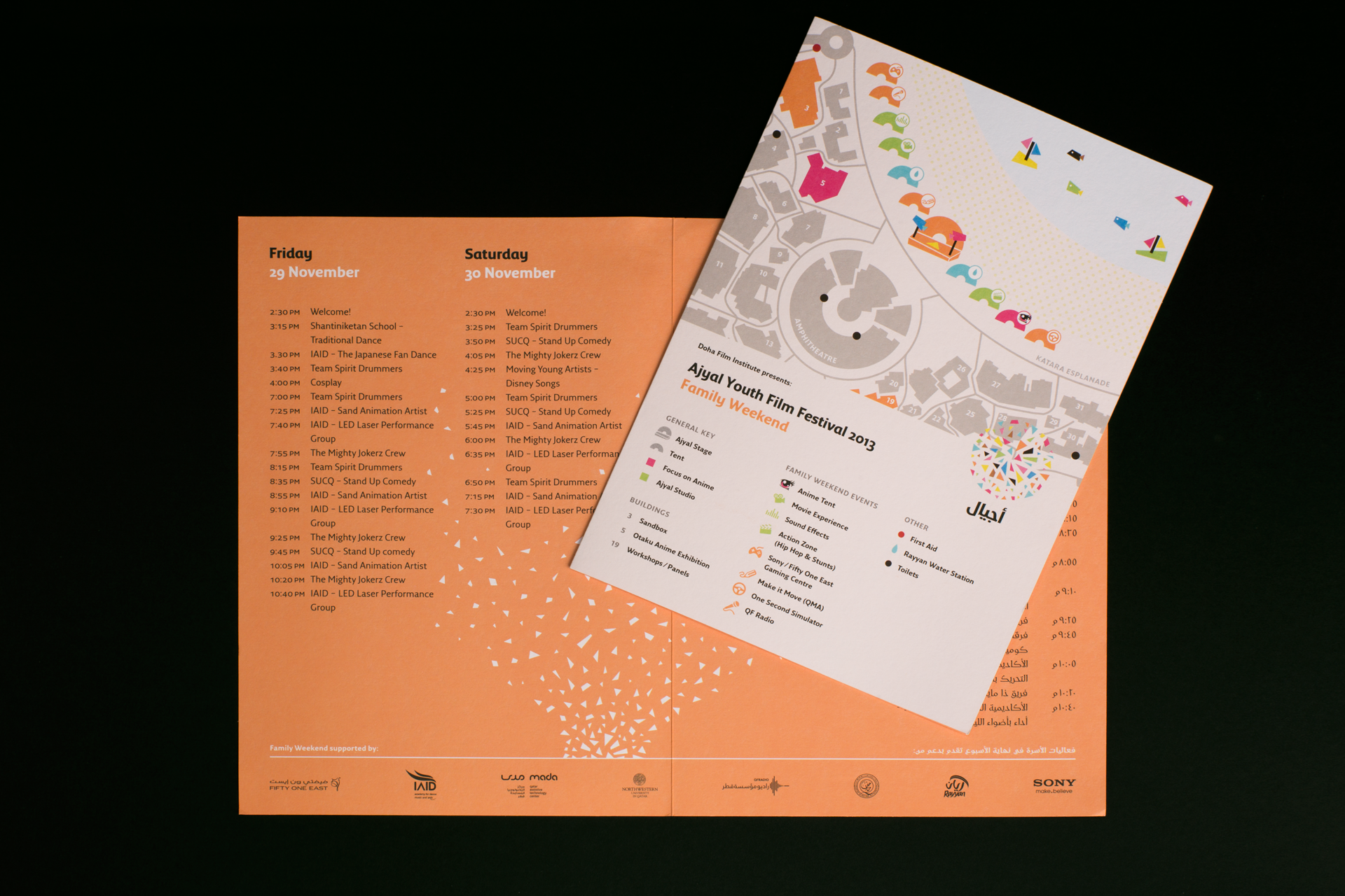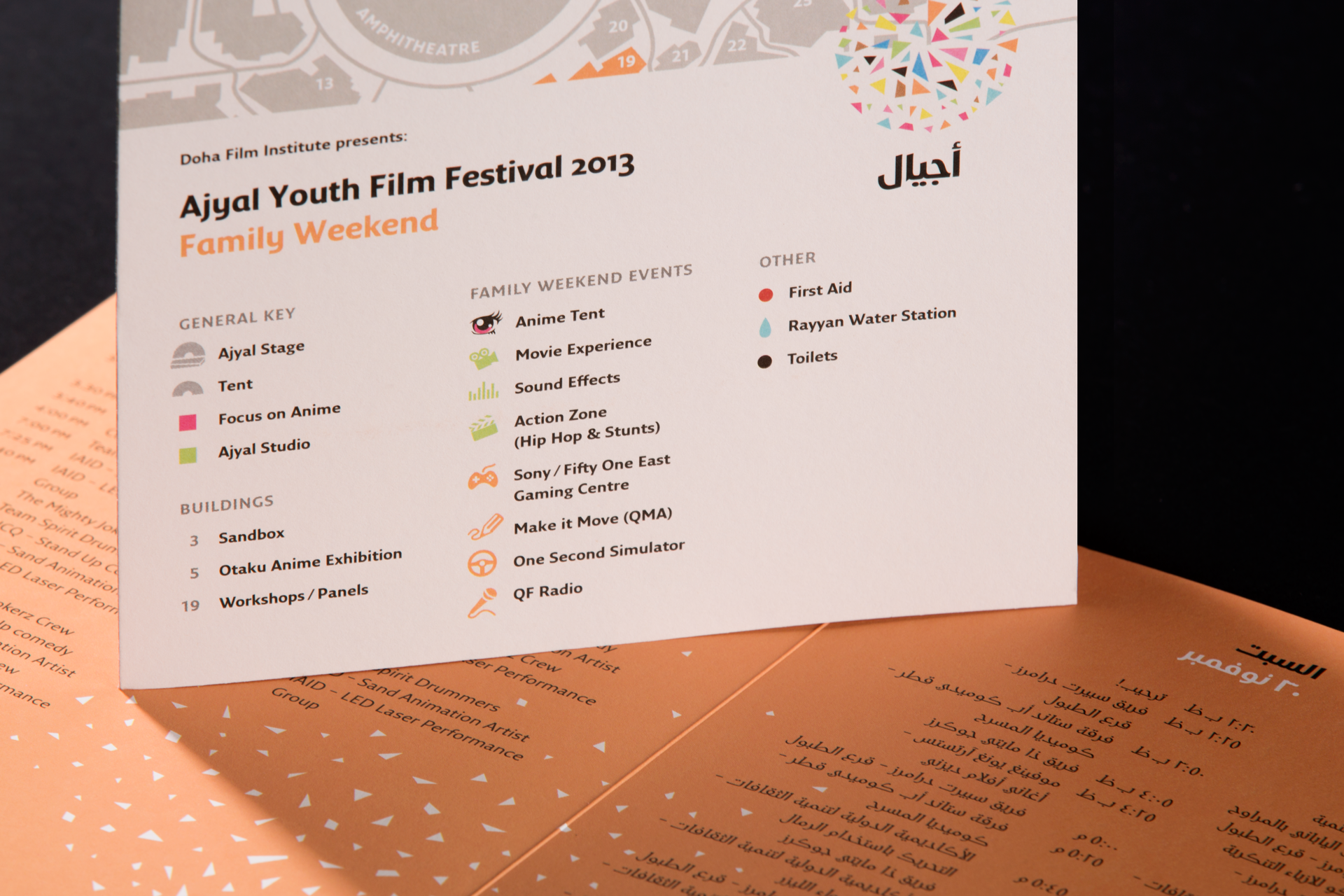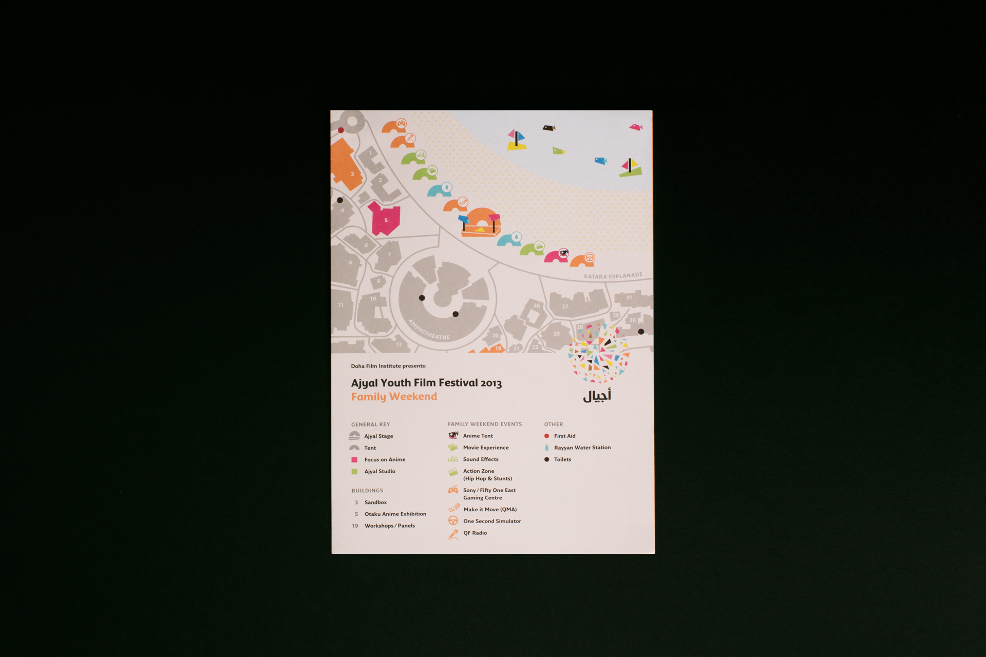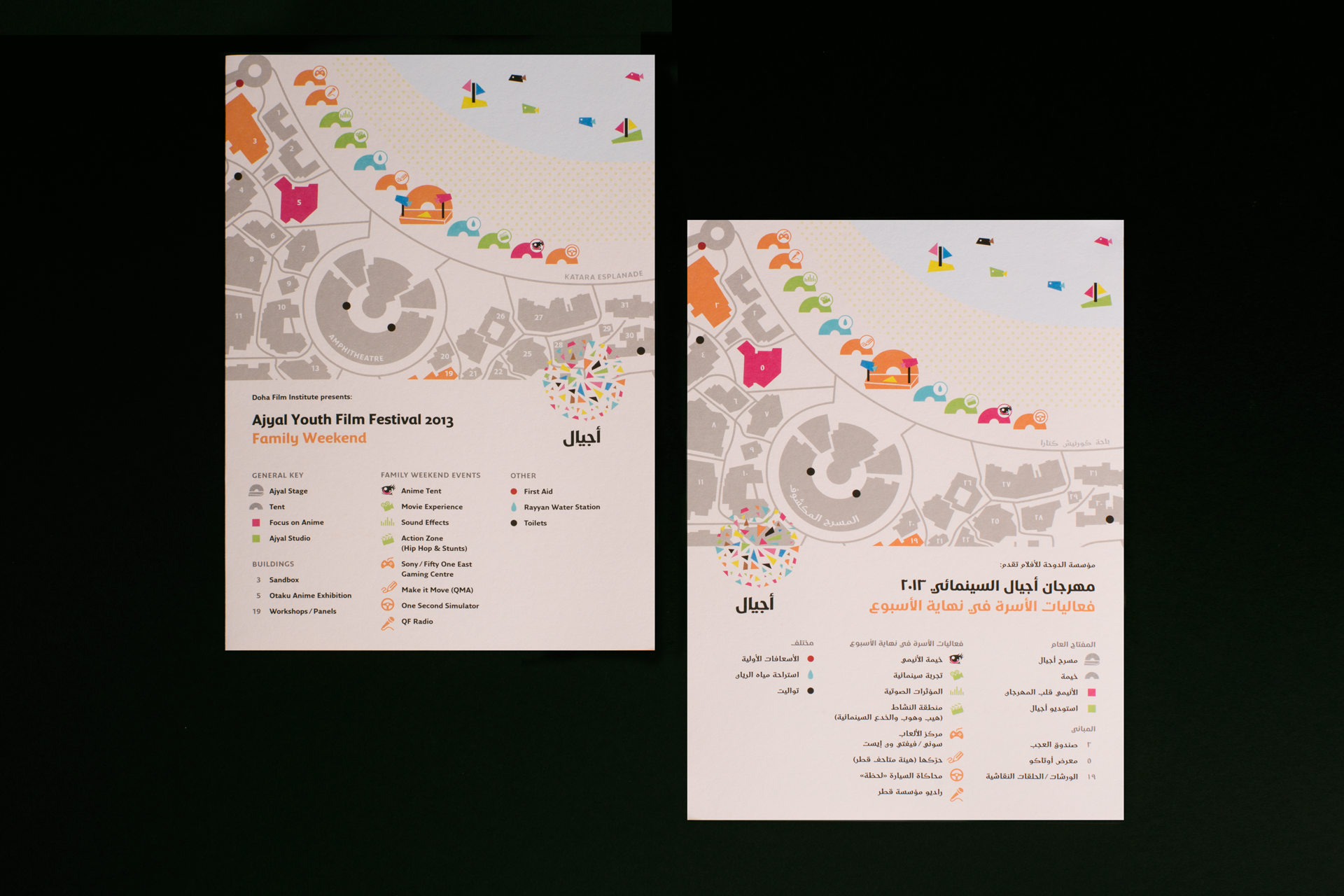 Bilingual folded map and schedule designed for the first edition of the Ajyal Youth Film Festival. Project done as part of / under the direction of the Design Team at Doha Film Institute. All rights reserved to Doha Film Institute.