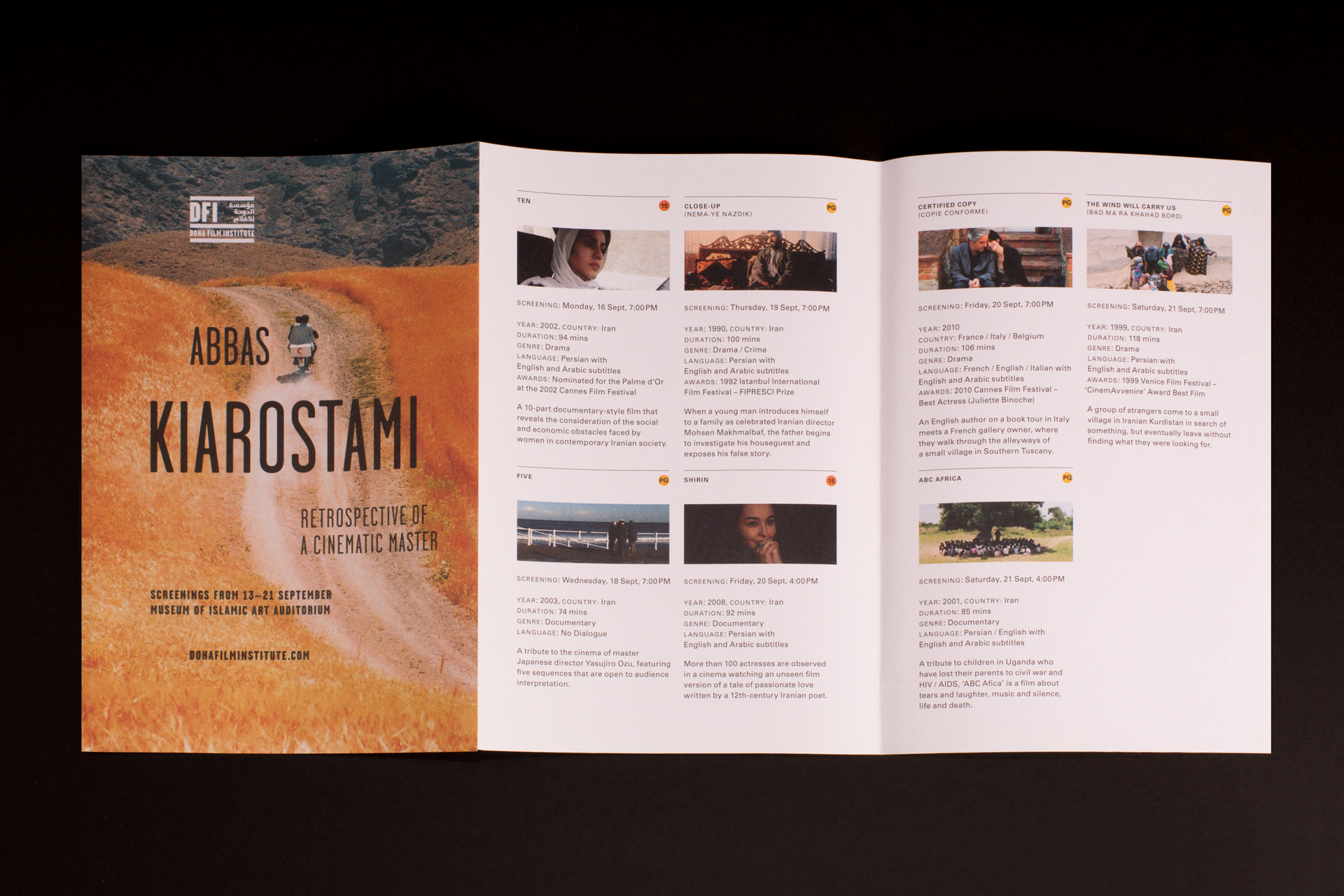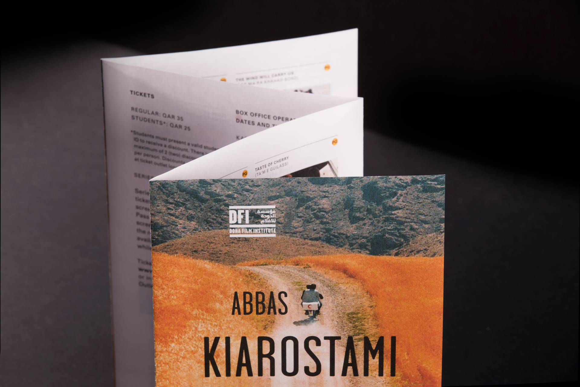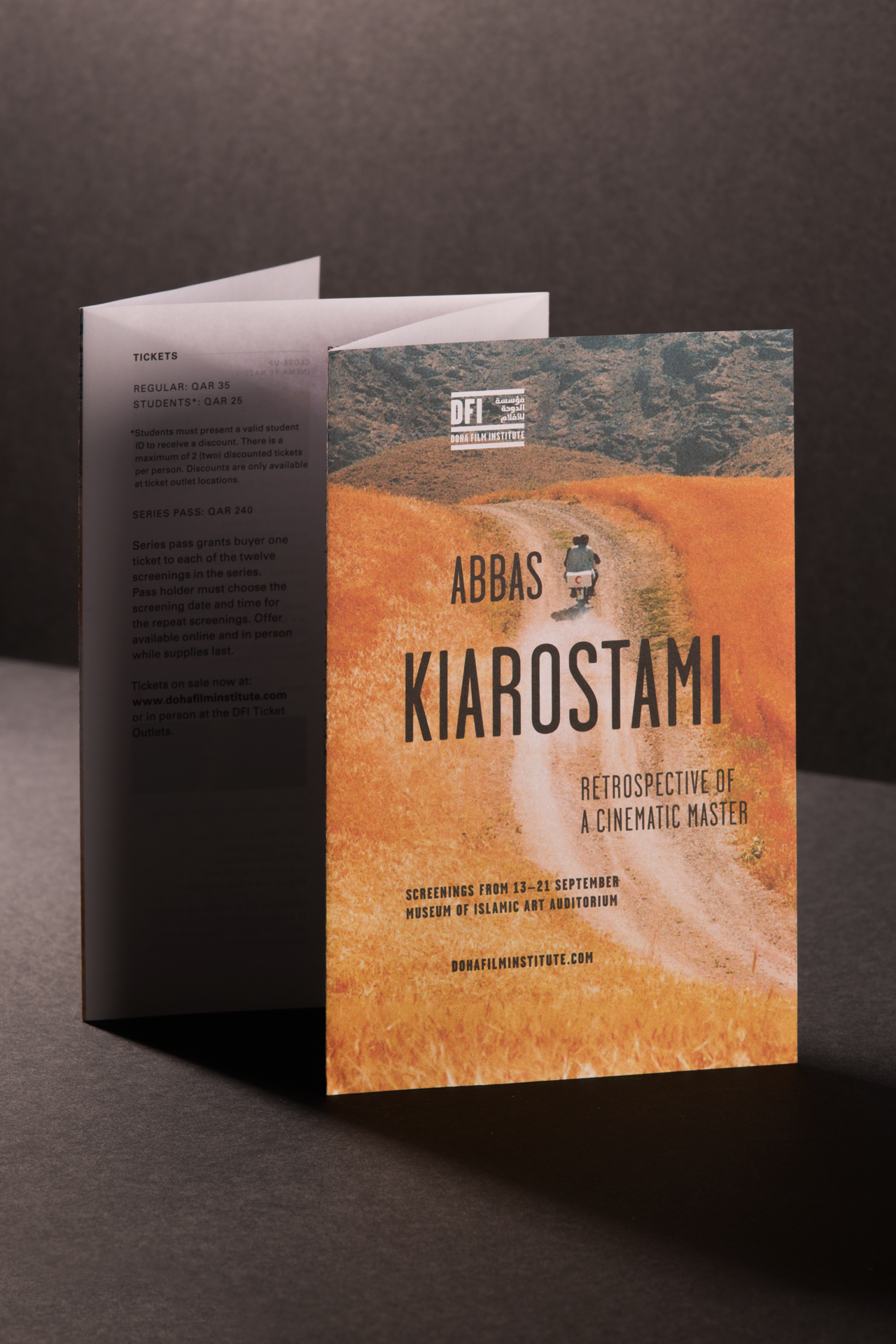 Bilingual pamphlet designed to promote a week of Kiarostami screenings. Project done as part of / under the direction of the Design Team at Doha Film Institute. All rights reserved to Doha Film Institute.